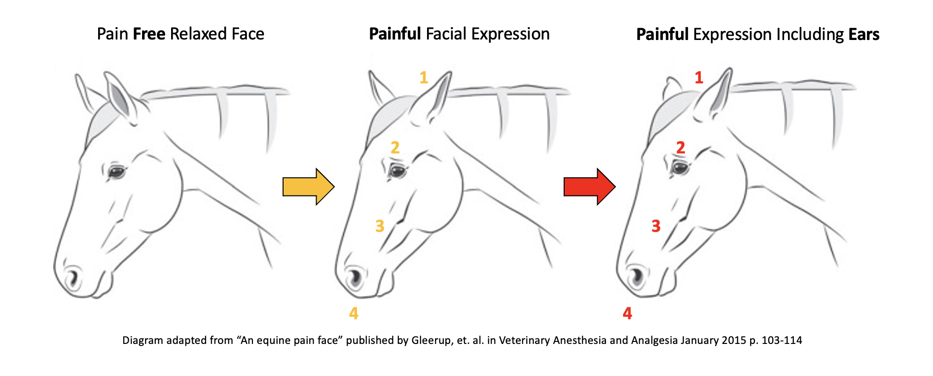 Interpreting a horse’s facial expression can be difficult. Just like humans, however, horses show signs of pain through facial expression, altered demeanor and behavioral cues. These clinical signs can be useful to determine when an individual is in pain. Dental disease in horses often goes undiagnosed until it is in an advanced or chronic stage when the clinical signs become unquestionable, either quitting or dropping hay, loosing significant weight, developing a swollen area on the face, or even nasal discharge or a draining tract somewhere in the skin. These are all signs of chronic disease that has been going on for months or even years. Earlier recognition of pain may be useful to diagnose dental disease at an earlier stage, improving quality of life and preventing unnecessarily prolonged discomfort.